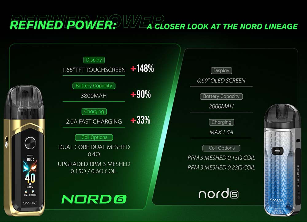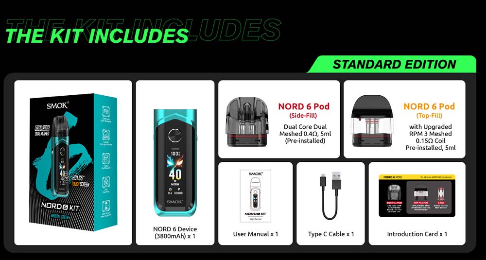 SMOK Nord 6 Pod Sistemi, 3800mAh pil kapasitesine sahiptir. 5W’tan 80W’a varabilen azami çıkış sağlar. Farklı kullanım alışkanlıklarına uyum gösterir. Değişen kullanıcı beklentileri ve özellikler için tasarlanmış büyük 1,65 inç dokunmatik paneli bulunur. Tercihinize göre tek sargıdan çift sargıya kadar alternatifler barındıran atomizerleri mevcuttur. Normal, Hafif ve Güçlendirilmiş seçenekleri içinden size en uygun olanı seçip tatmin olabilirsiniz.