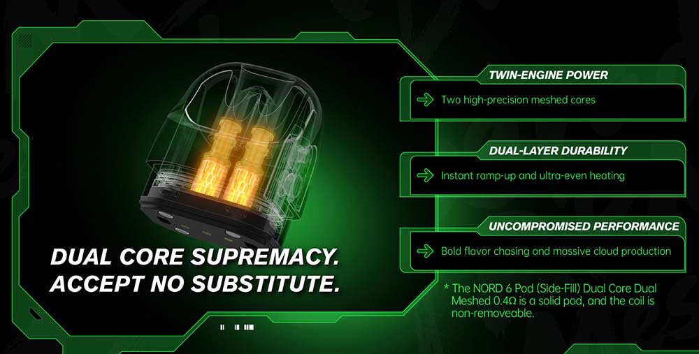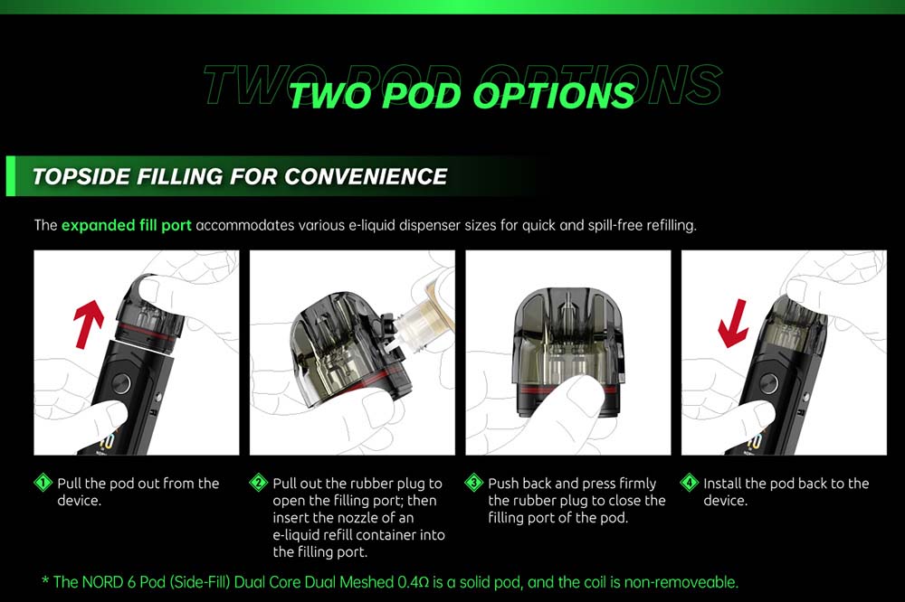 Üstten Likit Doldurma Kartuşu bakımından: Değiştirilebilir ateşleme serisi içerir ve RPM3 atomizerleriyle ortak çalışır. Bu nedenle Nord5’e yakın görünüm taşır.