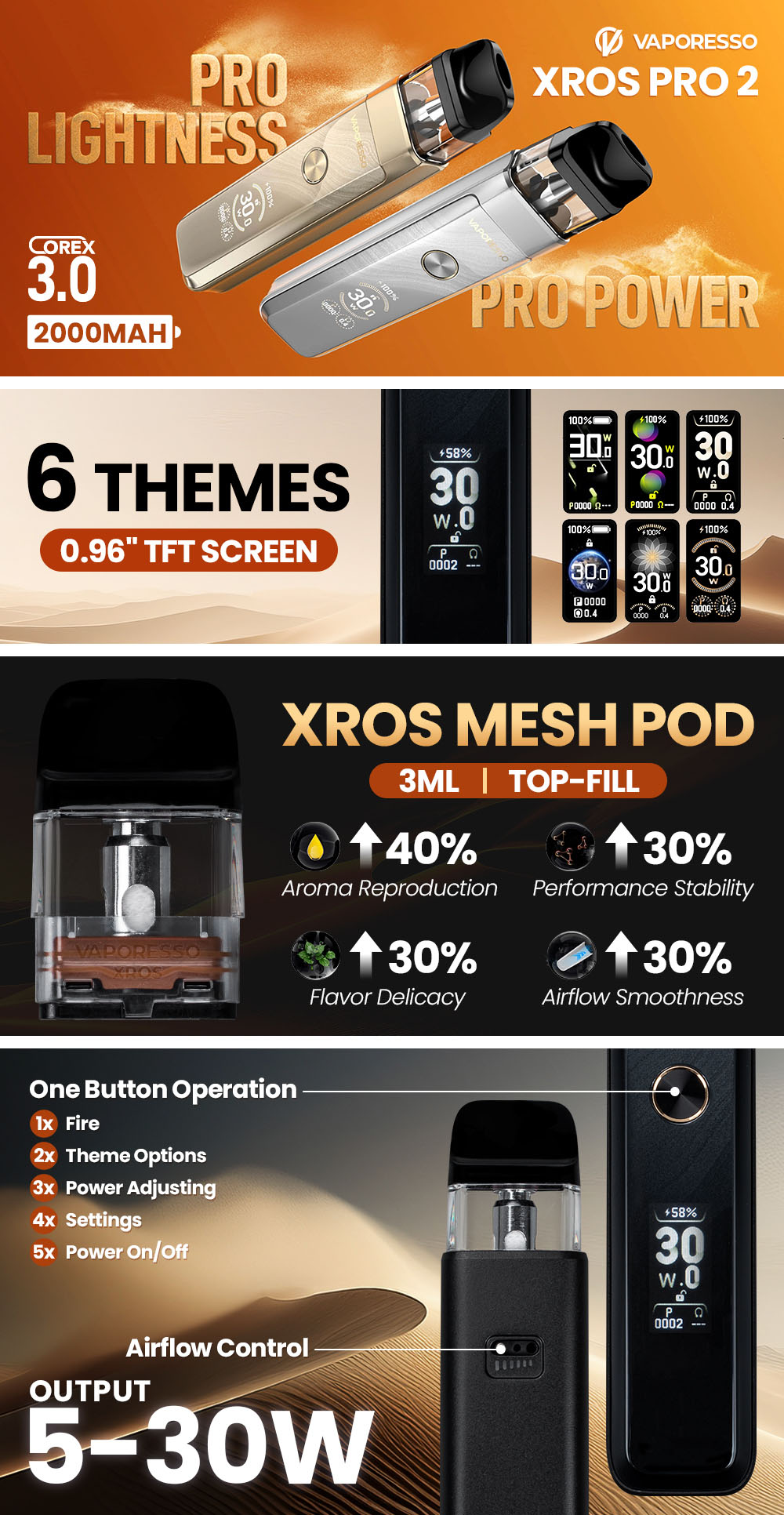 XROS Pro 2, COREX 3.0 sistemi ile berrak lezzet ve düzenli buhar yoğunluğu gayeler. 3 mililitrelik üstten beslemeli tank, kaçak riskini sınırlandırır ve her gün kullanımda konfor sağlar. 0.96 inç TFT dijital ekran, güç derecesi, akü durumu ve çekim sayısı gibi tüm parametreleri net biçimde ifade eder. Ayarlanabilir hava girişi vasıtasıyla MTL, RDL ve DL içim modları aynı aygıt bünyesinde elde edilir. Vaporesso XROS Pro 2, gerek kıdemli kullanıcılar gerekse üstün pod teknolojisi arayanlar için performanslı ve dengeli bir tercihtir.